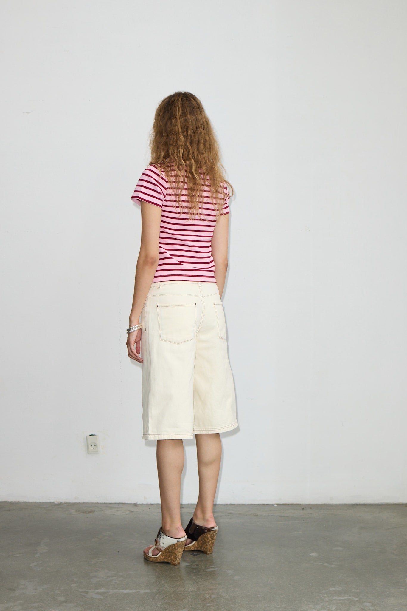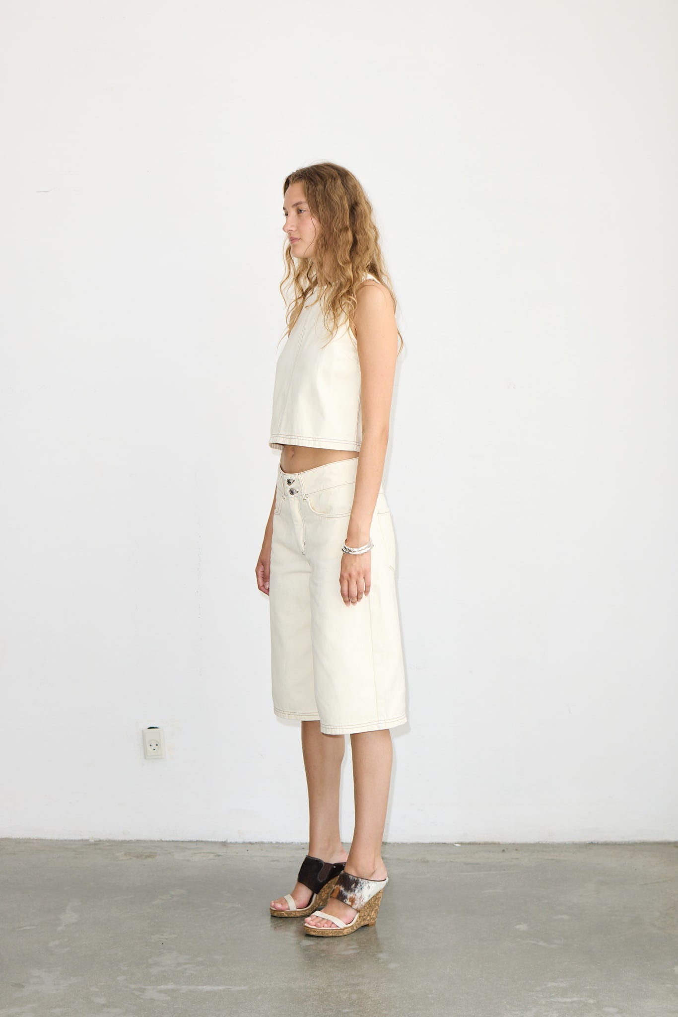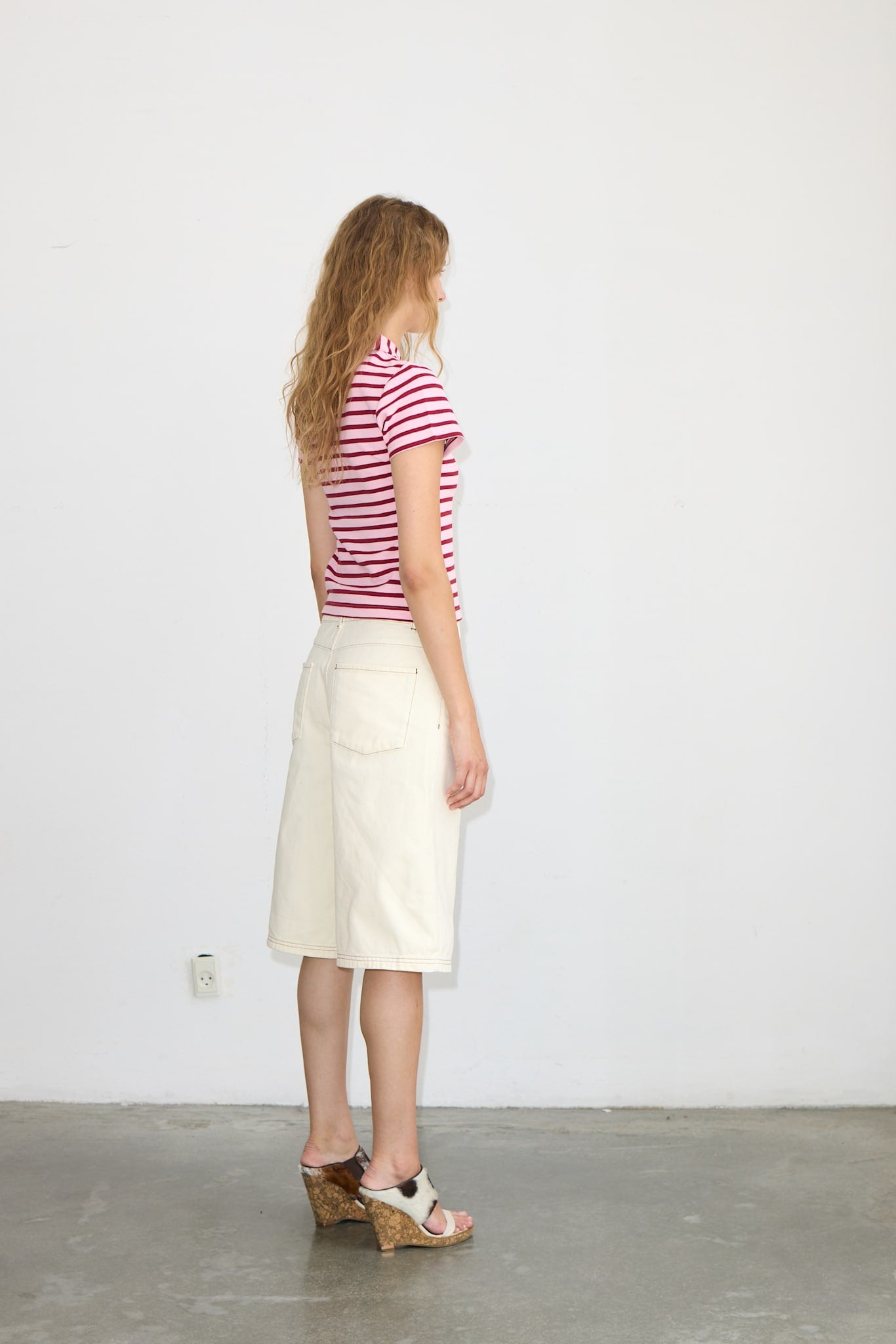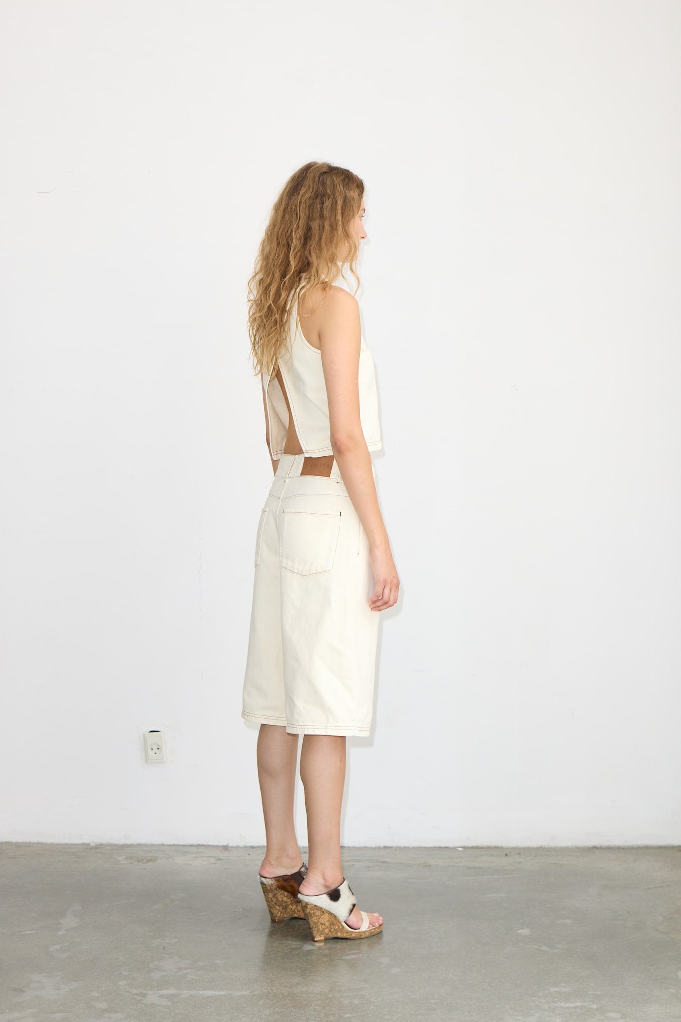 The Bree Denim Shorts are crafted from 100% cotton in Off white. Designed with a relaxed, knee-length fit, they feature a straight silhouette and a timeless five-pocket design. Finished with a button and zip closure, they are a versatile staple that can be styled up or down.