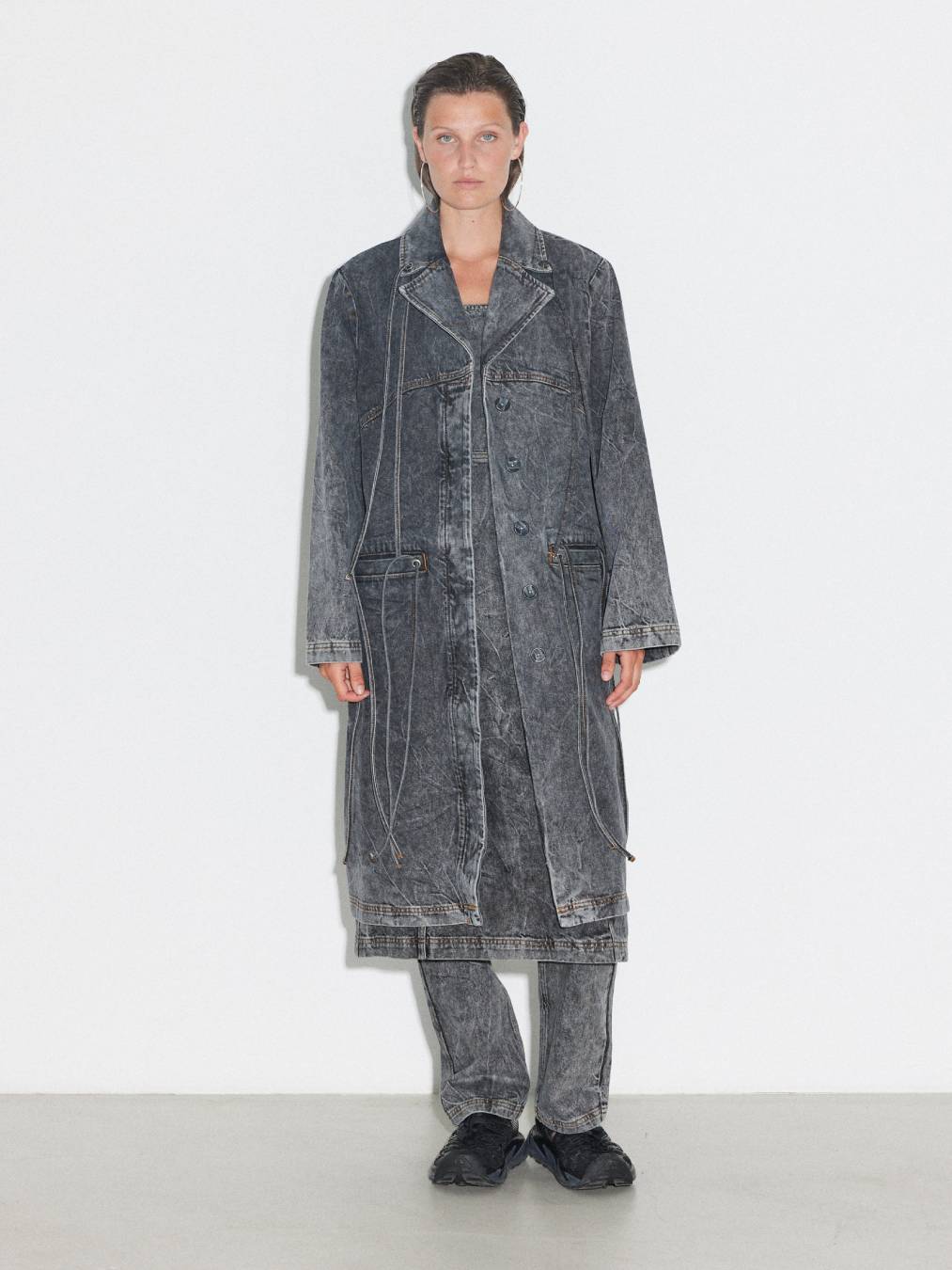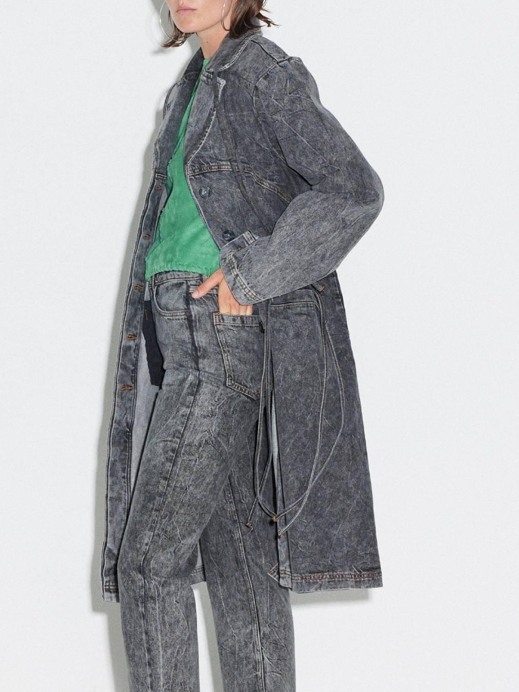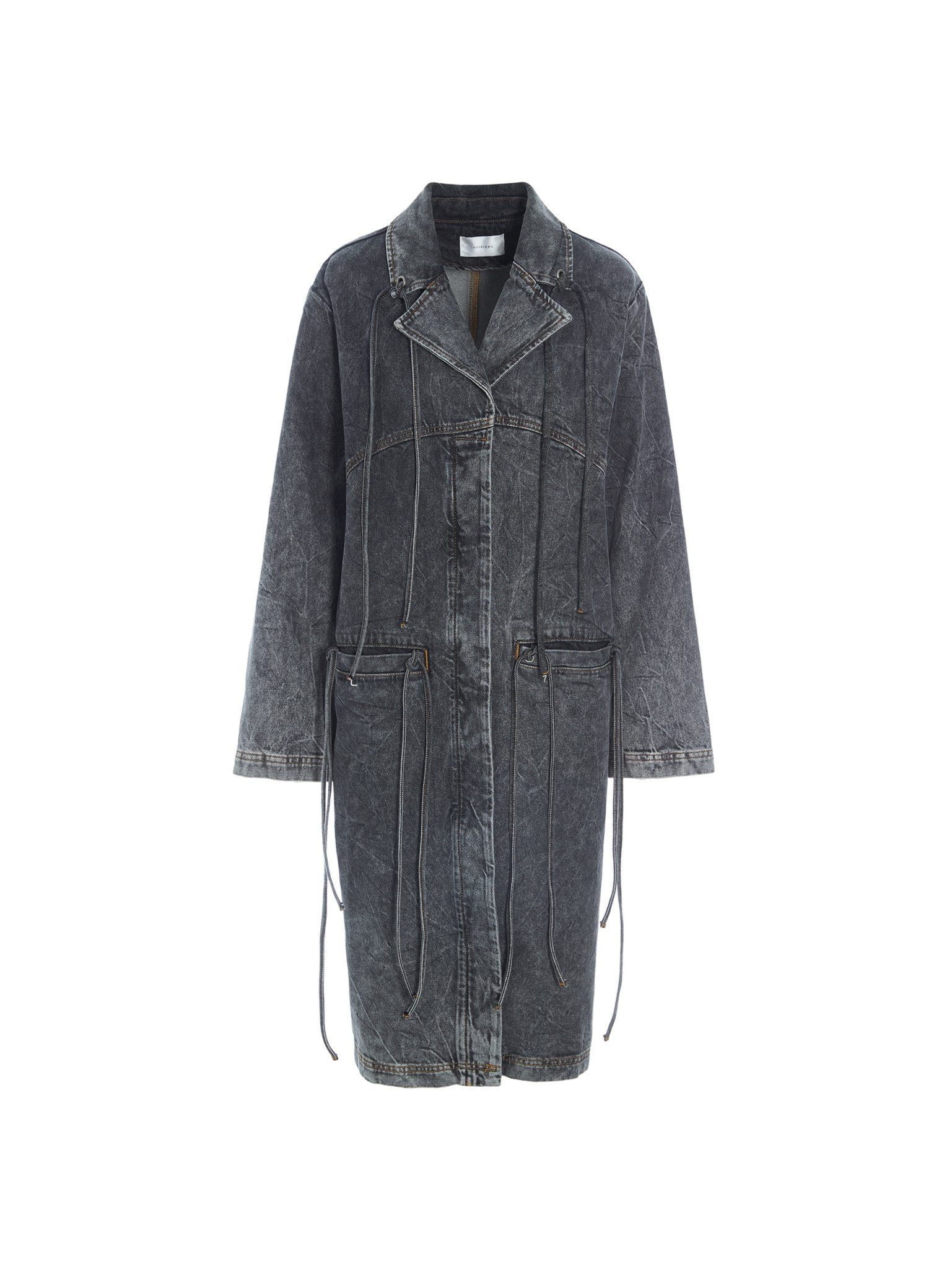 This denim coat is a street-style essential that will lend a cool vibe to any occasion. The stone-washed finish creates a faded pattern unique to each piece, while drawstrings and pockets add extra detail to the coat. Throw it over your outfit to exude a sexy and slightly mysterious aura, completing your overall look.