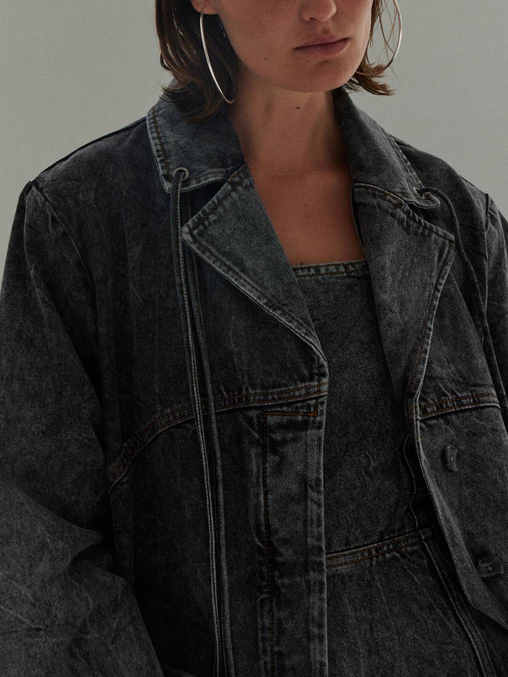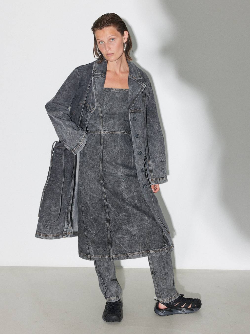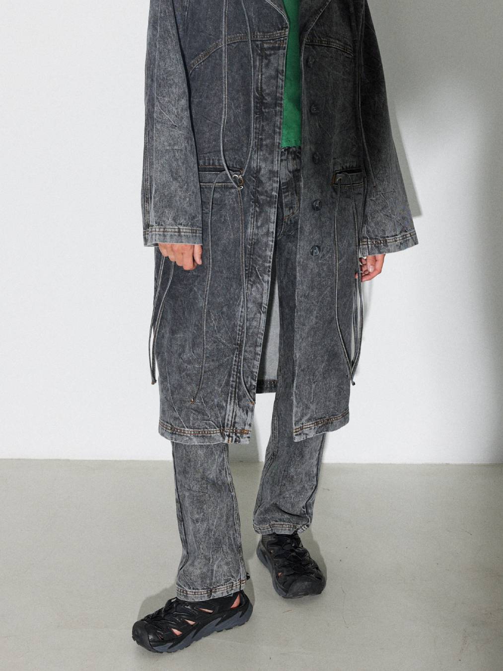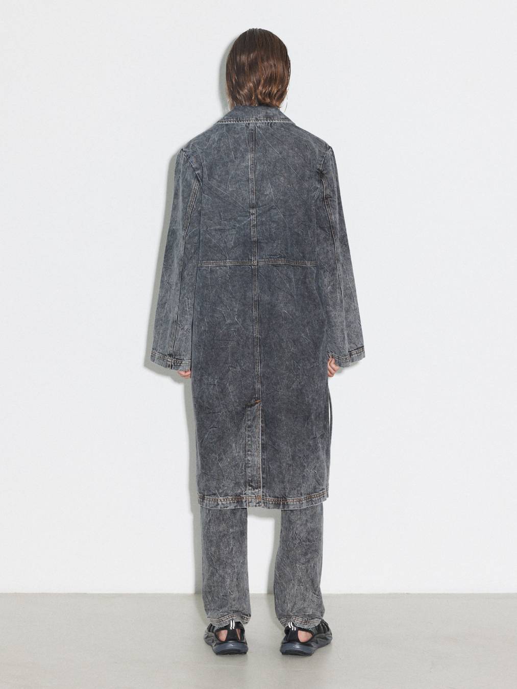 This denim coat is a street-style essential that will lend a cool vibe to any occasion. The stone-washed finish creates a faded pattern unique to each piece, while drawstrings and pockets add extra detail to the coat. Throw it over your outfit to exude a sexy and slightly mysterious aura, completing your overall look.